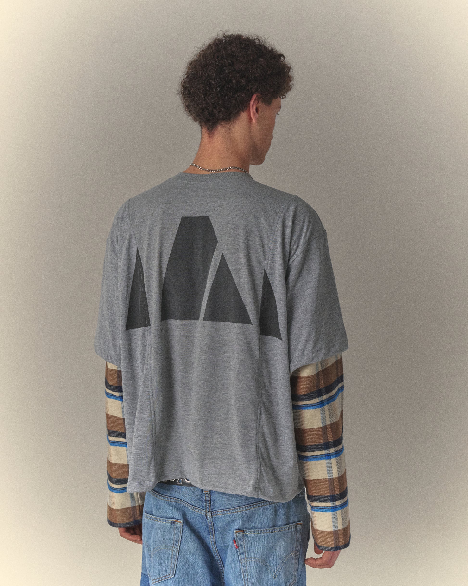 The piece features a double sleeve construction: a clean outer layer paired with an inner sleeve made from deadstock tartan flannel, creating depth and contrast through layered structure.