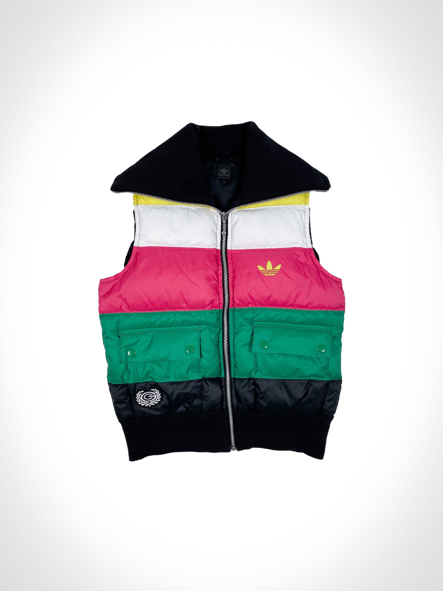 Vest multicolor imbottito Adidas 3 stripes, munito di tasche e zip, con colletto extra large.